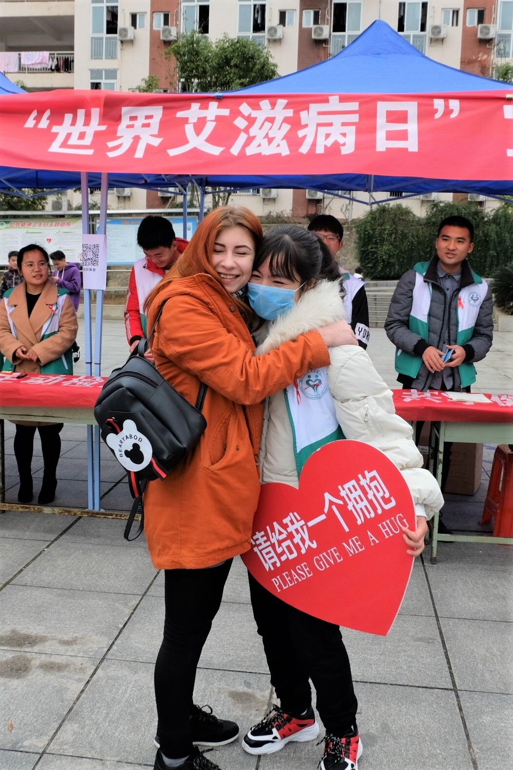 活动现场,由工作人员为校内同学佩戴红丝带,红丝带代表着对艾滋病感染者的关心、支持,同时也象征着一种希望。同时由扮演“艾滋病患者”的同学,佩戴上“请给我一个拥抱”的红心,进行“呼吁拥抱”的活动,现场的同学们感触到:仿佛亲身体验了一次艾滋病感染者的心理感受,有点难受、也很失落,呼吁大家要发自内心的去关心、接纳他们。随后,为了传递“健康、安全性行为”等意识,工作人员还向校内同学发放了安全套。最后,出席活动的嘉宾和同伴社工作人员进行了合影。活动圆满结束。