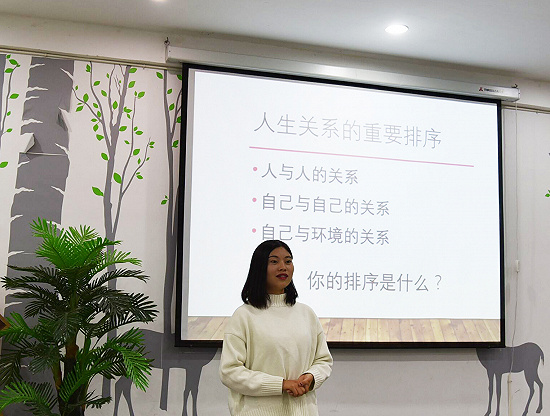 活动开始,主持人以“你做我猜”的游戏为切入点,引出本次活动的主题——人际沟通的智慧。其间,大家齐心协力制作手工作品,作品顺利完成后,让同学们懂得了沟通的重要性,懂得沟通比盲目去做要事半功倍。接着,主持人讲了人际沟通存在的三个关系,即自己与自己、人与人和人与环境的关系。主持人通过案例详细分析了人在沟通时三个关系的主次问题。人的三大关系同时发生,相互制约,相互促进,缺一不可。