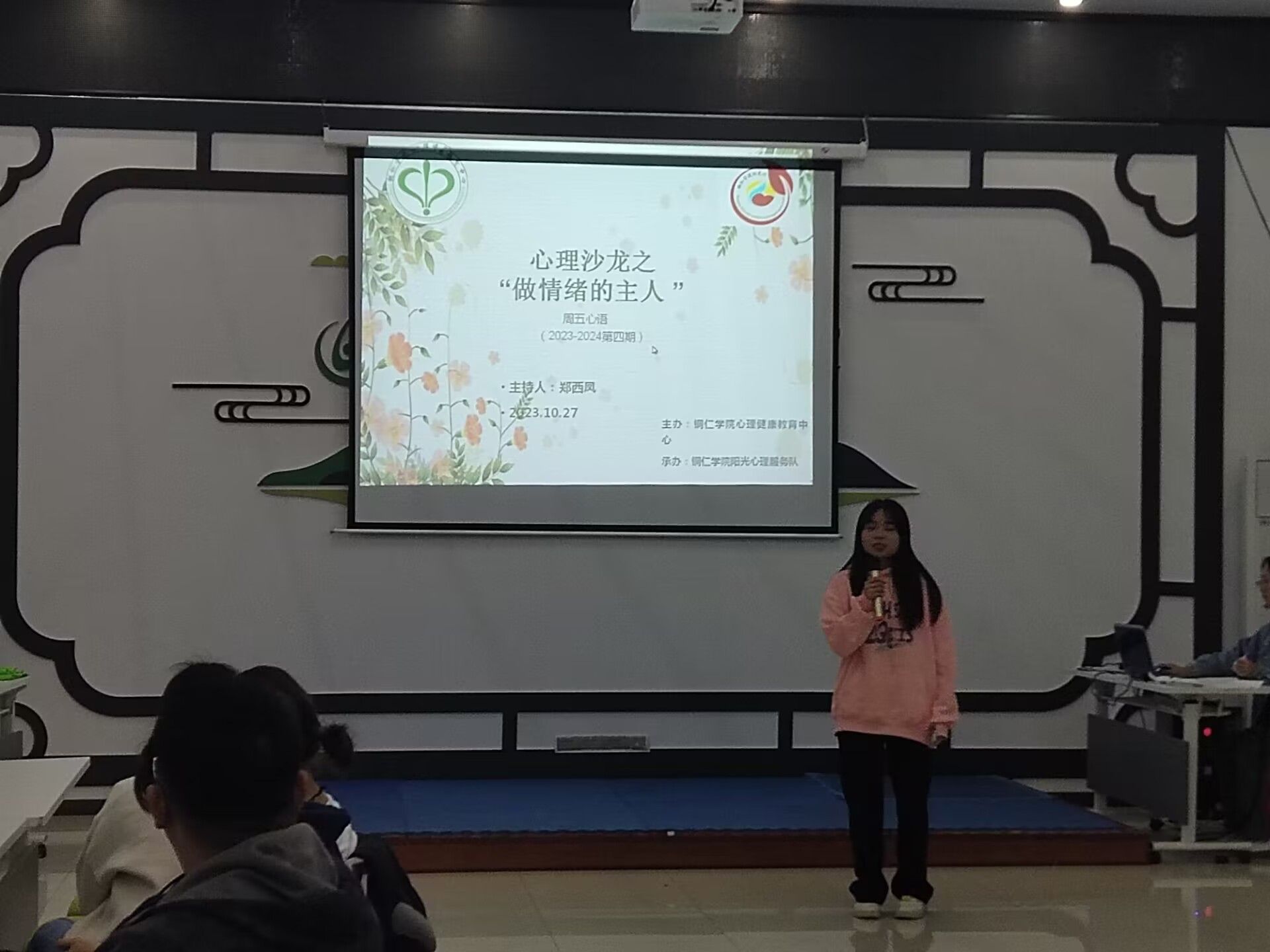 10月27日晚,伟德官网心理健康教育中心在多功能室开展了周五心语活动——心理沙龙之“做情绪的主人”。此次活动由2022级制药工程班郑西凤同学主持,共有来自不同学院的40名同学共同参加。