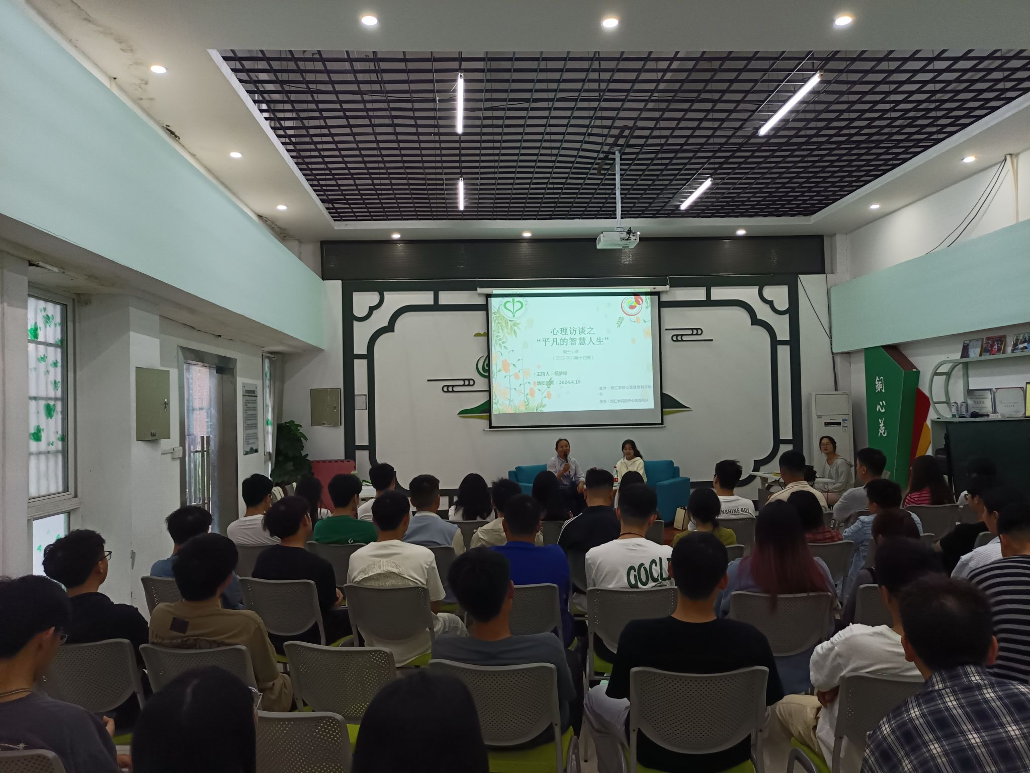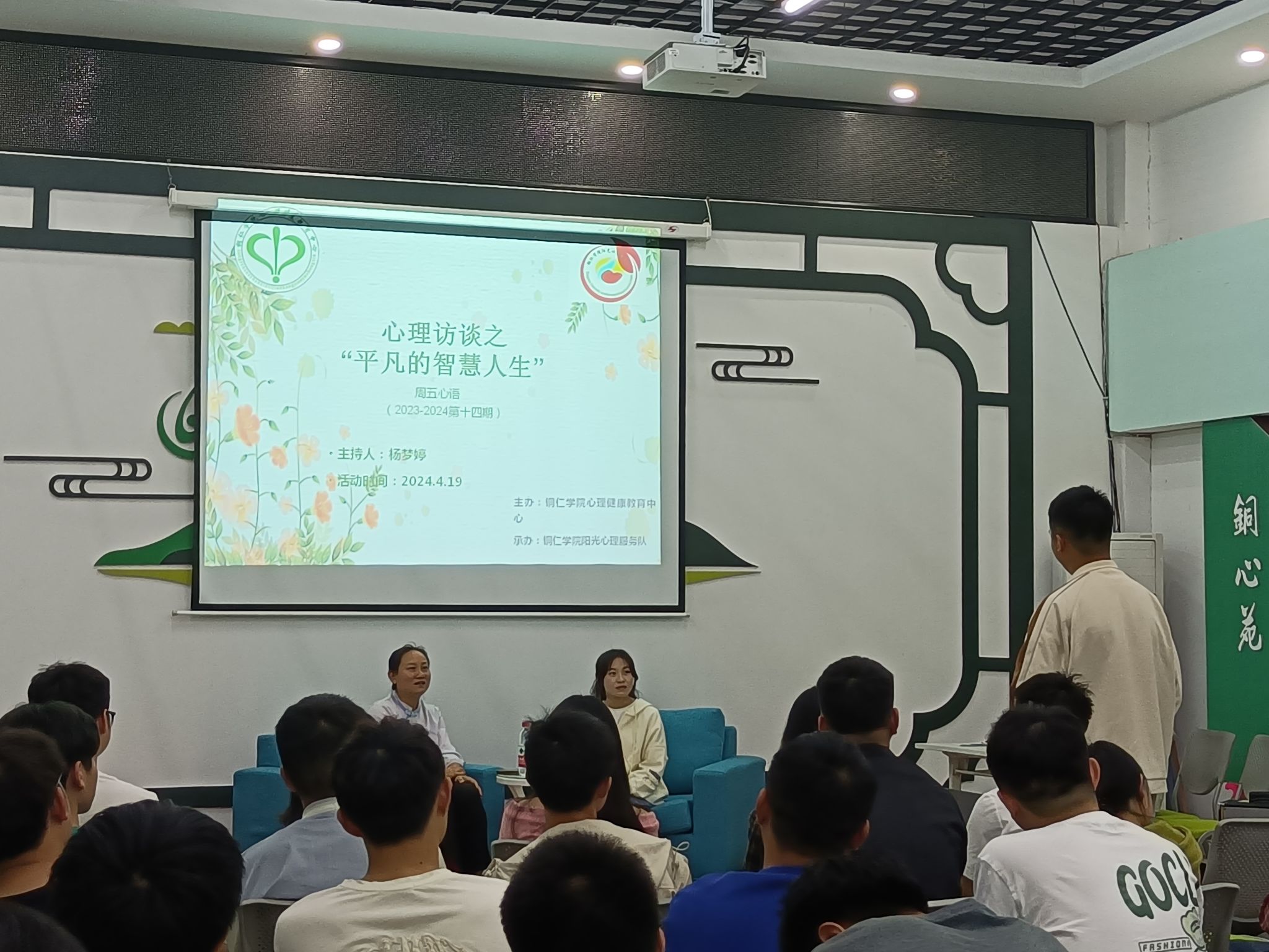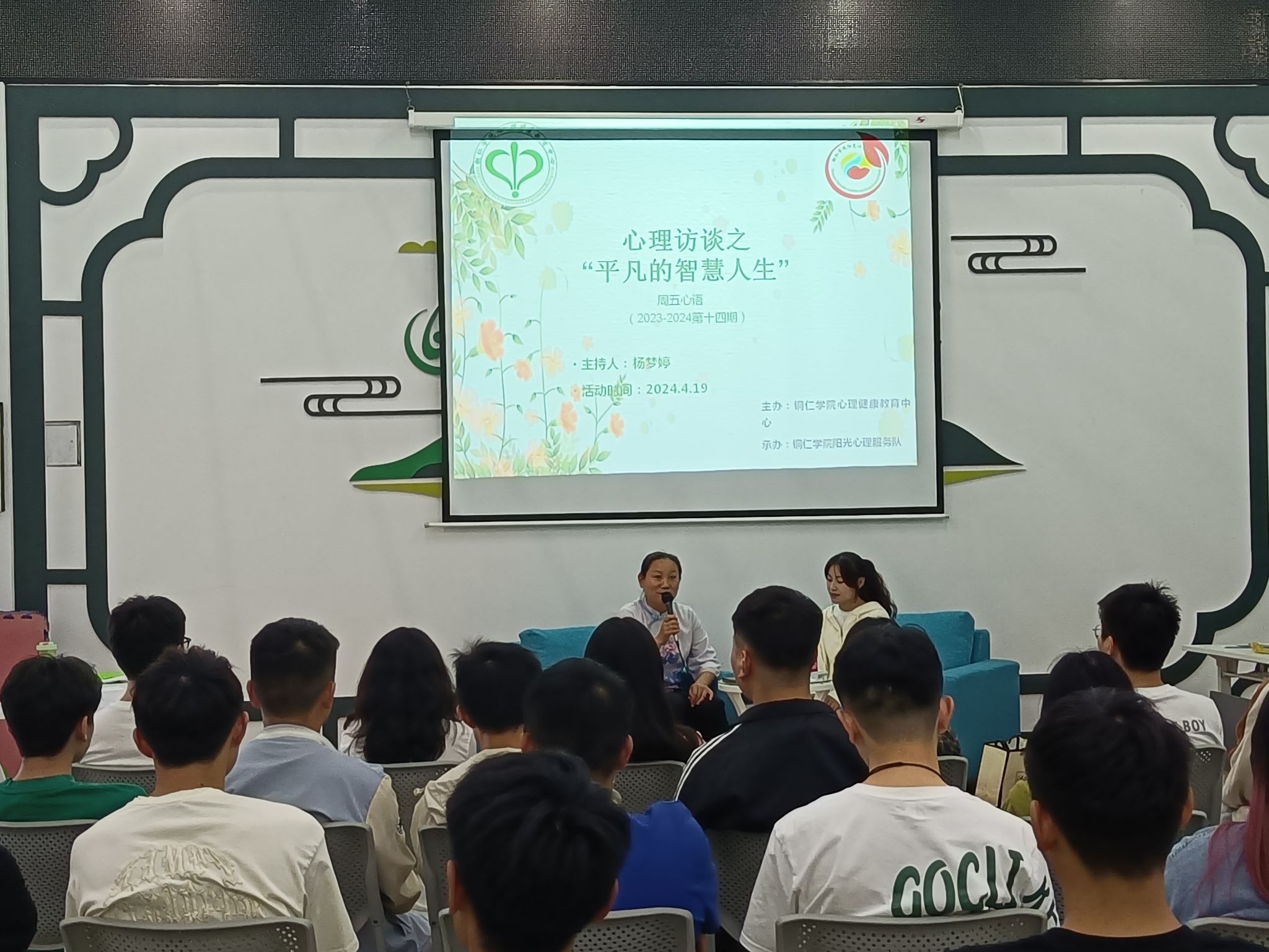 4月19日晚,伟德官网心理健康教育中心在多功能室开展了2023-2024第十四期周五心语活动——心理访谈之“平凡的智慧人生”。本次活动由2023级网络与新媒体班杨梦婷主持,特邀bv伟德国际1946副教授、国家高级国学文化传承师景卫华老师作分享与交流,共有50位来自不同学院的同学共同参与。