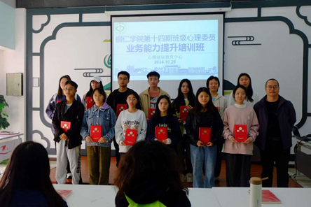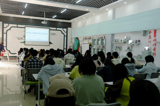 会上,首先进行朋辈心理辅导员聘任仪式,宋健老师为13名朋辈心理辅导员颁发聘书。随后,全体人员到心理健康教育中心大门前合影留念。接着,由宋健老师为大家进行“班级心理委员的工作艺术”的培训讲座,宋老师首先强调了班级心理委员的工作职责以及对班级心理健康管理的重要性,精准明确了心理委员的工作定位。随后,宋健主任指导围绕心理委员的职责与角色、常见心理问题的识别与应对、沟通技巧与方法等方面展开了详细讲解,并通过一系列生动的案例分析,让心理委员们更加直观地了解到在日常学习和生活中如何及时发现同学们的心理问题,并给予有效的支持和帮助。