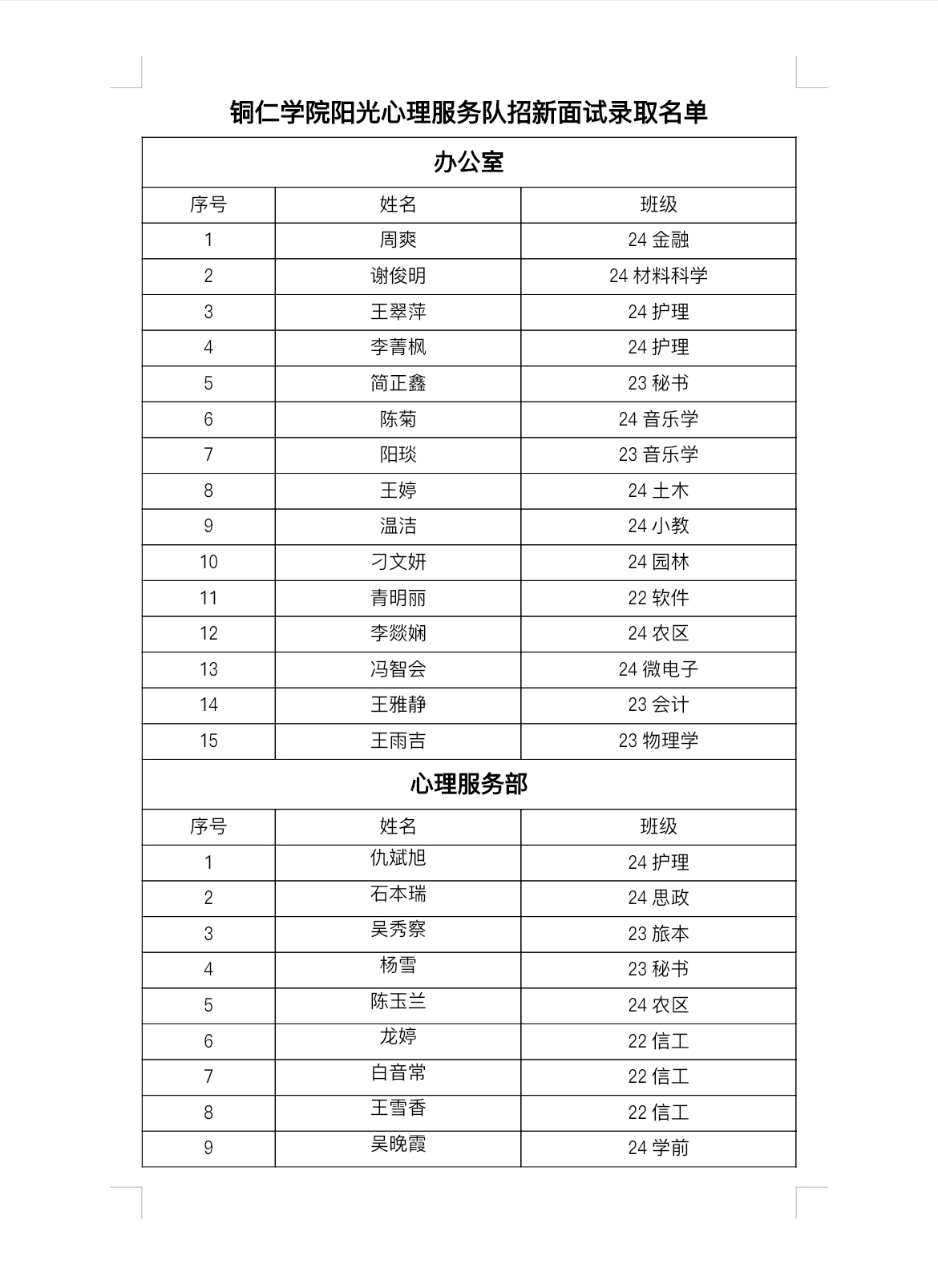 面试结束后,各部门负责人和工作人员简单沟通,汇报整理招新人员情况,大家也都表示对此次面试非常的满意。经队内干部讨论筛选,招新录取名单已确定(名单附后)。此次招新为阳光心理服务队增添了新生力量,愿新成员能在队中实现自身价值,不断前行。