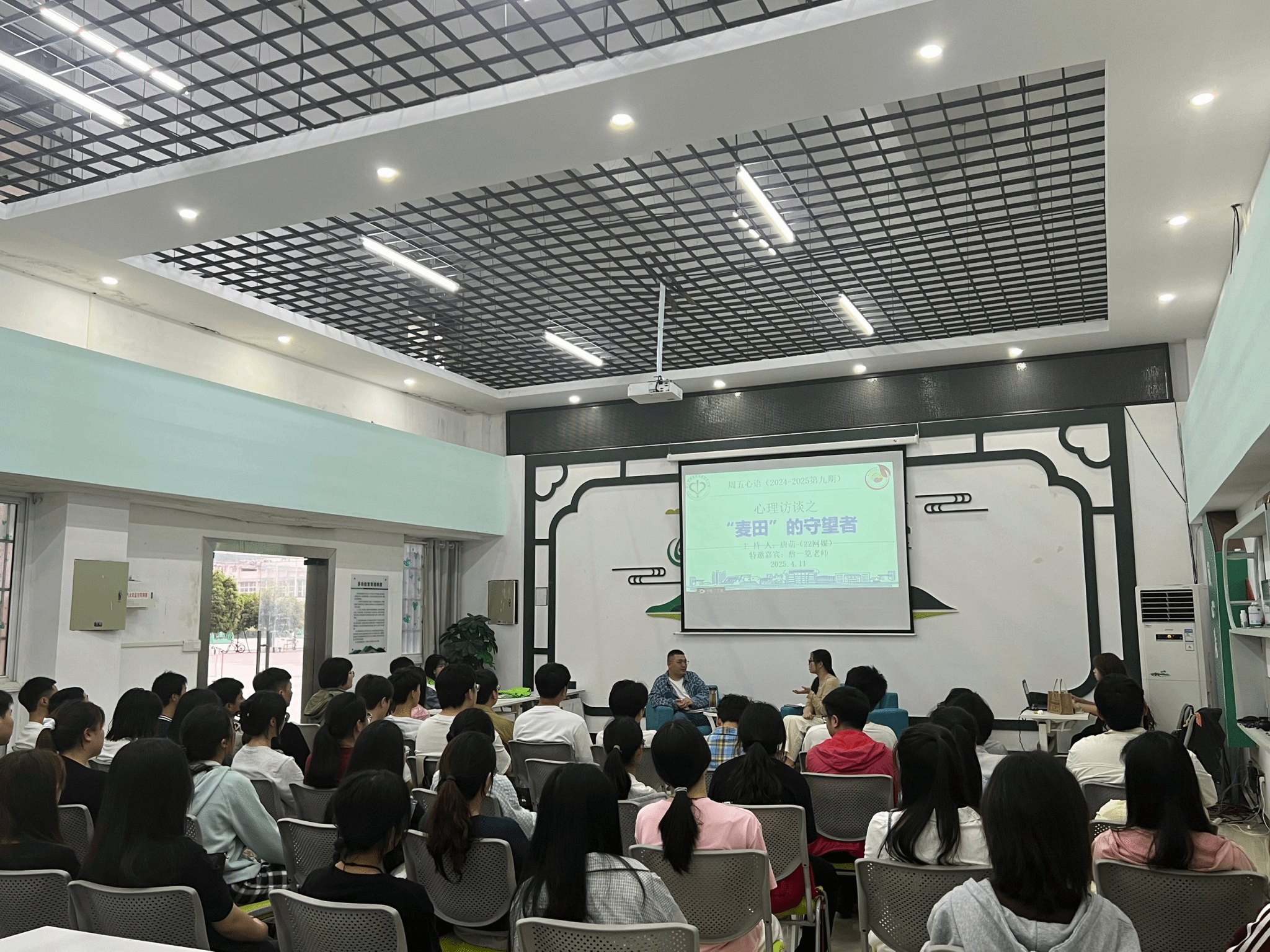 4月11日晚,伟德官网心理健康教育中心在多功能室开展了2024-2025第九期周五心语活动——心理访谈之“‘麦田’的守望者”。本次活动由2022级网络与新媒体班唐萌同学主持,特邀伟德官网学生工作处学生公寓管理中心主任,国家二级创业咨询师,高级职业规划师,KAB创业讲师詹一览老师作分享交流,共有50余名来自不同学院的同学参与。