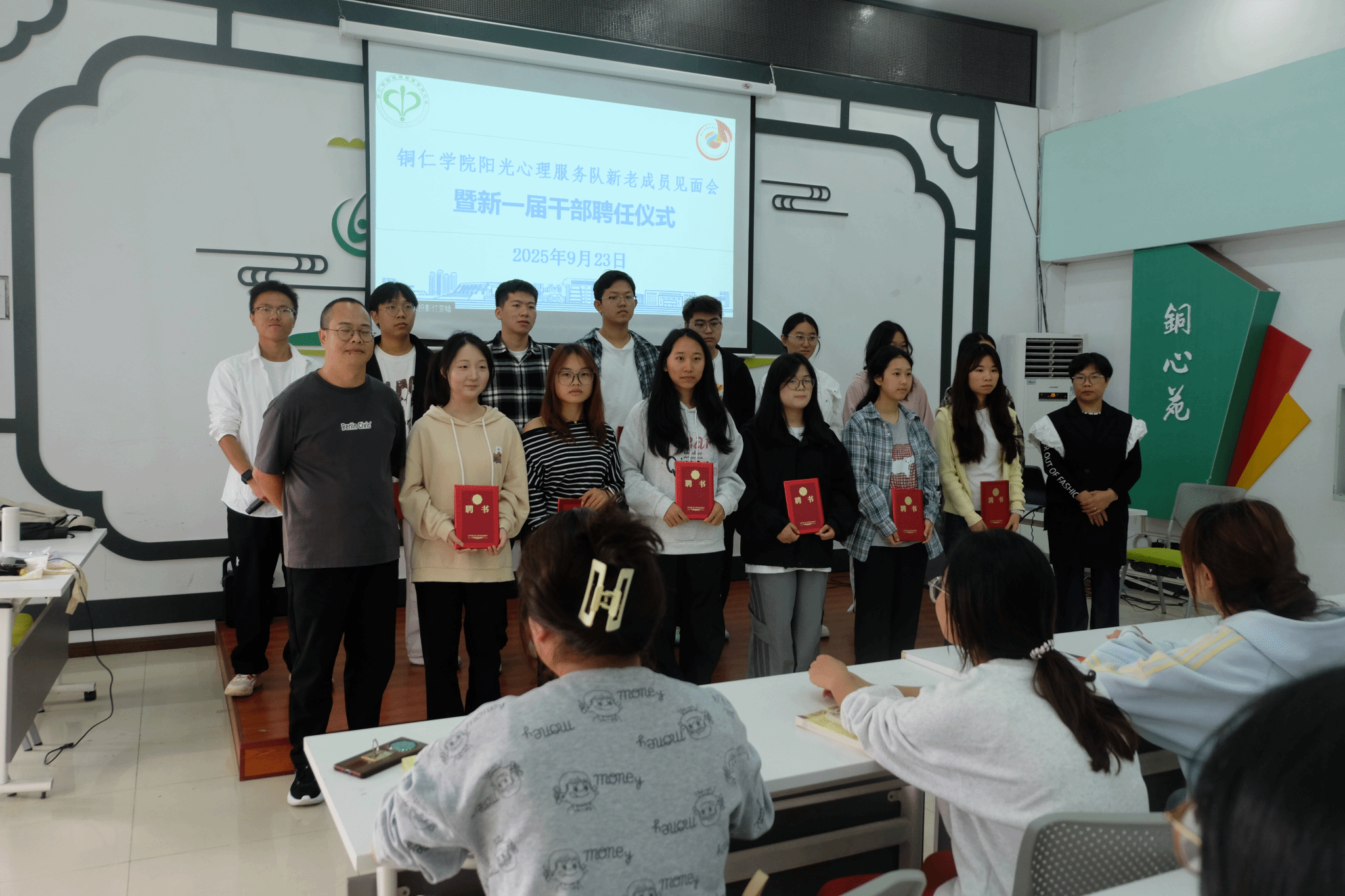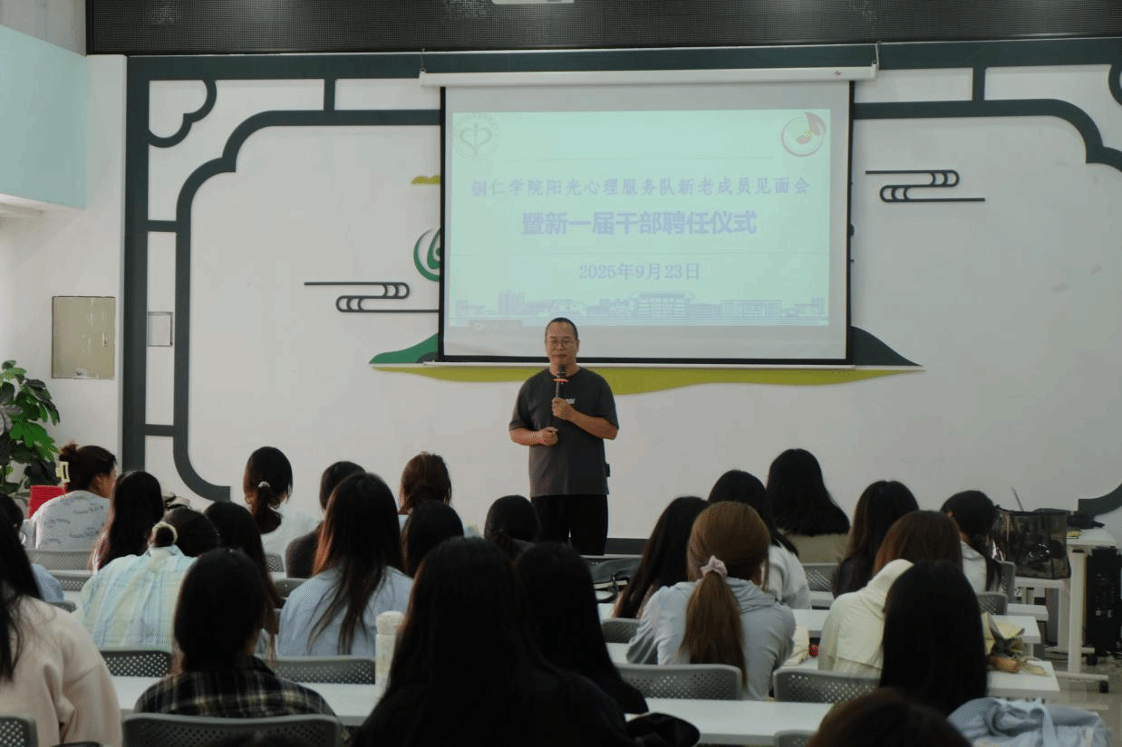 见面会伊始,新一届干部聘任仪式正式举行。宋老师现场为新一届全体干部颁发聘书。随后,宋老师发表讲话,他首先对新加入阳光心理服务队的同学表示欢迎,并对新当选的干部表示祝贺。紧接着以阳光心理服务队的历史为切入点介绍了阳光心理服务队的发展历程、宗旨和主要活动,以及在关注心理健康、提供心理支持方面发挥的重要作用。他鼓励新成员们积极参与到各项活动中,为更多的人带来温暖和帮助。