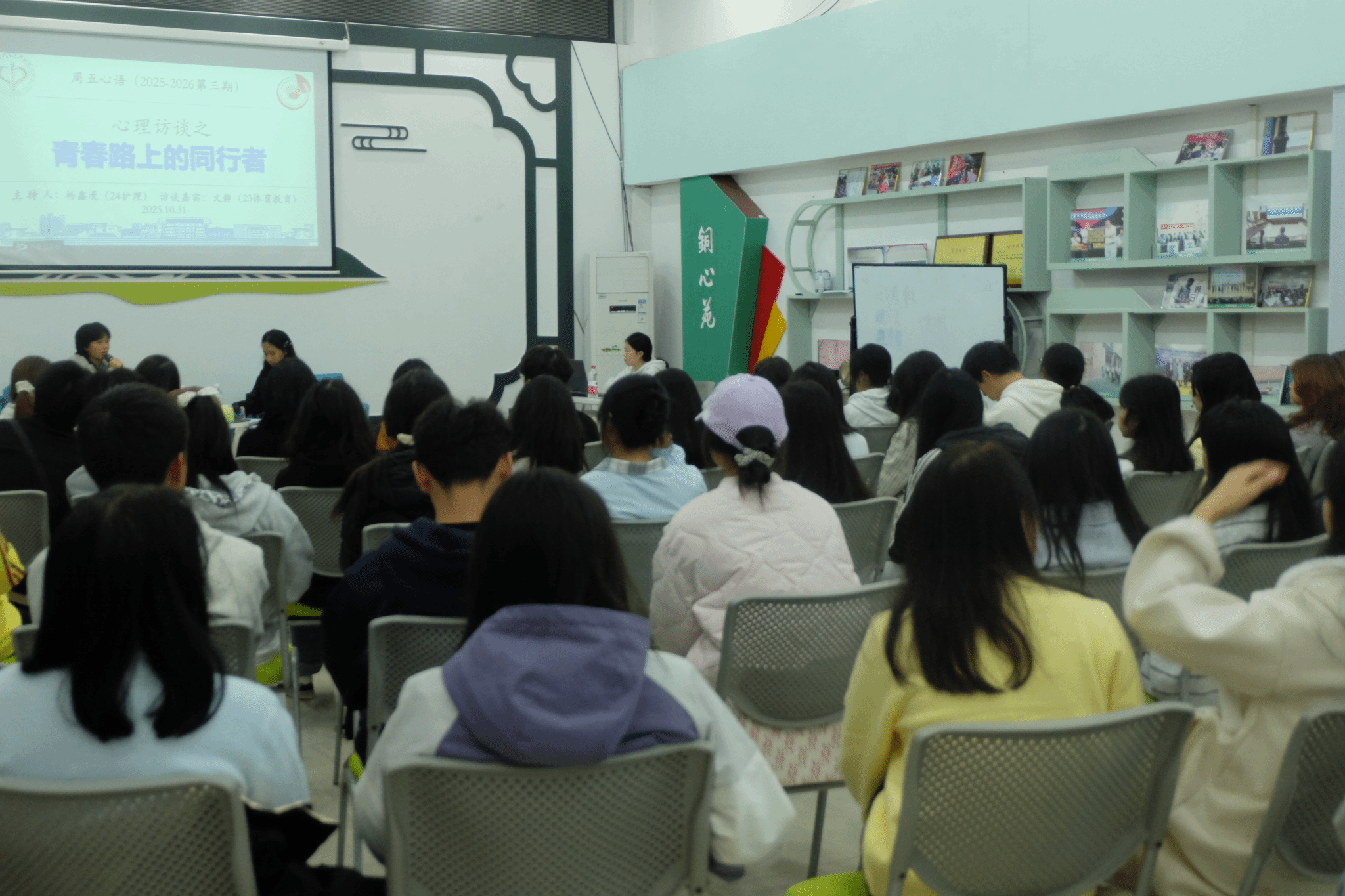 10月31日晚,伟德官网心理健康教育中心在多功能室举办2025-2026学年第三期“周五心语”活动——心理访谈之“青春路上的同行者”。本次活动由2024级护理学班杨鑫漫同学主持,特邀2023级体育教育2班文静同学作为访谈嘉宾,来自不同学院的50余名同学共同参与。