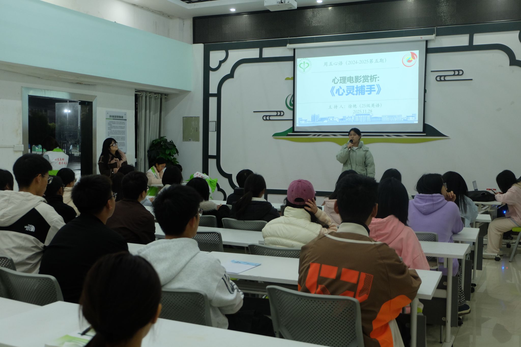 11月28日晚,伟德官网心理健康教育中心在多功能室开展了2025-2026第五期周五心语活动——心理电影赏析之《心灵捕手》。此次活动由2025级英语2班的徐艳同学主持分享,共有60余名来自不同学院的同学共同参与。