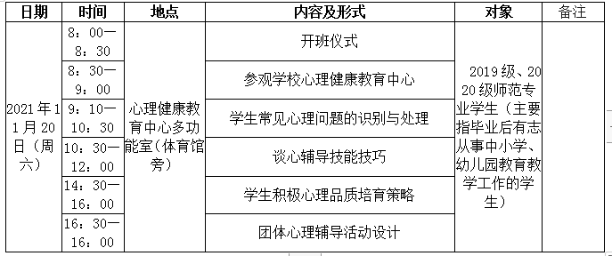 2、参训者须按时参加培训,不得请假。如有特殊情况,须以书面形式向学校心理健康教育中心请假。