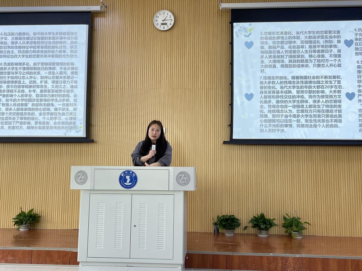 本次的讲座由心理工作站的郑秋实老师主讲并由余飘同学主持。在讲座开始前主持人以简短的开场白介绍了本次讲座的大概内容并提醒同学们将手机关机等注意事项。讲座进行时,郑老师以校园中常见的情侣相处方式向我们介绍该如何树立一个正确的爱情观,并且要时刻注意如何保护自己,在此过程中郑老师以自身经历来告诫我们要如何看待爱情。对女生最重要的事除了树立正确的爱情观以外,还有就是如何看待“性”,在这个问题上,郑老师由性是什么、性常识、培养爱的能力及自尊培养四个方面来为我们讲解了“性”的各方面知识。最后郑老师告诉同学们,大学生应该把时间和精力放在学业上,摆正爱情与学业的关系。