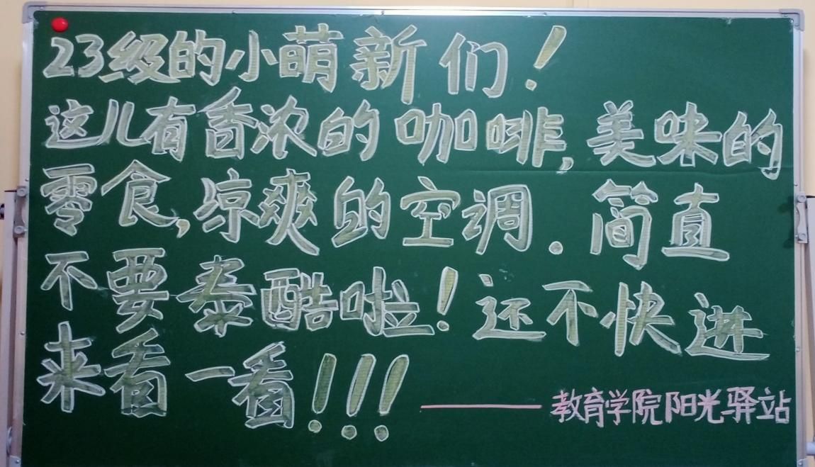 此次活动主要分为两个部分:首先,活动前一天,工作人员们齐心协力,共同营造出一个温馨舒适的场所,供新生、新生家长及志愿者们休息;并且在线上及线下进行了广泛地宣传,以吸引同学们的到来;其次,活动当天,工作人员们以饱满的热情迎接来阳光驿站休息的同学及家长,并向新生们介绍了教育学院的专业特色以及阳光驿站在教育学院的作用。