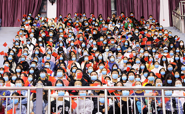 典礼在铿锵豪迈的《祖国不会忘记》歌声中缓缓落下帷幕。最后,全场人员起立,手里挥舞着鲜艳的五星红旗,坚定地发出青春的誓言:请党放心,强国有我。