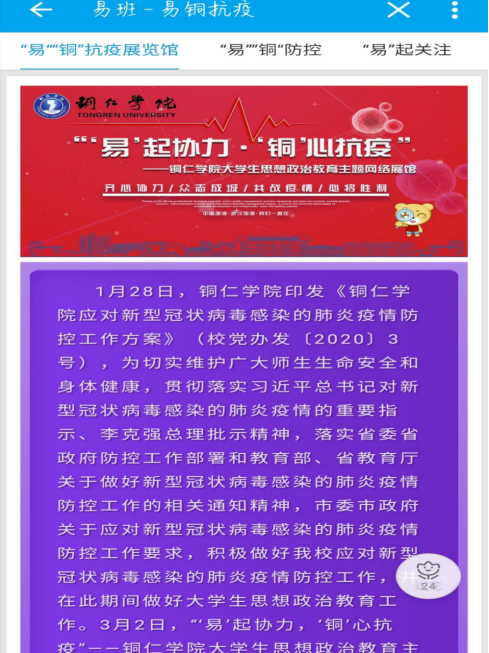 2020年,随着新冠肺炎疫情的爆发,全国齐心抗疫的时刻,伟德官网易班按照省教育厅、学校党委的要求,推出“‘易’起协力·‘铜’心抗疫”——bv伟德国际1946大学生思政教育主题网络展馆,并组织全校学生在易班优课学习疫情下的青年责任担当等内容的学习,学生线上学习完成率达95%,营造了坚定不移的“战疫”氛围。