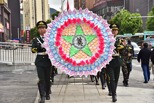 活动伊始,民兵应急分队派代表敬送花圈,全体成员并脱帽为先烈默哀。
