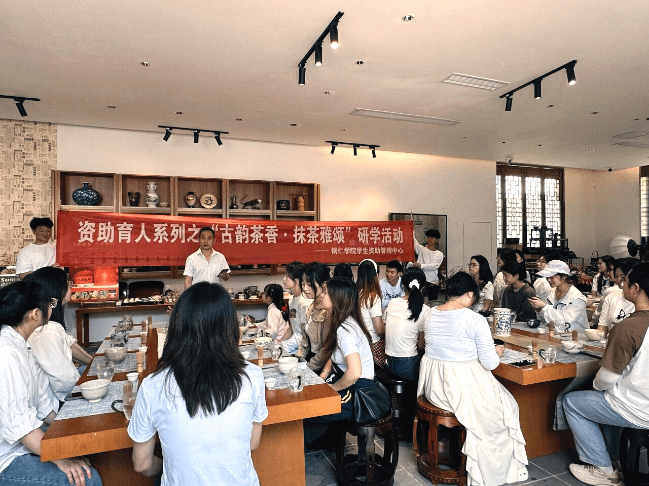 4月19日,bv伟德国际1946学生资助管理中心组织30余名对中国抹茶文化感兴趣的受资助学生,前往抹香集铜仁抹茶文化体验中心开展资助育人系列之“古韵茶香·抹茶雅颂”研学活动,开启沉浸式抹茶文化探索之旅,近距离感受抹茶文化的魅力和风采。