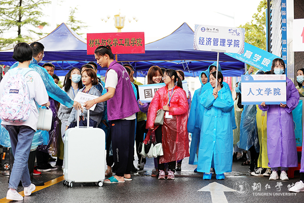 校园大道里,志愿者们身着五颜六色的雨衣,额头上的雨水跟汗水夹杂在一起,雨衣里也蒙上一层薄雾,扛着棉被袋、拉着行李箱,陪着新生来回奔波,丝毫没有慢下脚步,让新来的学弟学妹感受到了家的温暖。