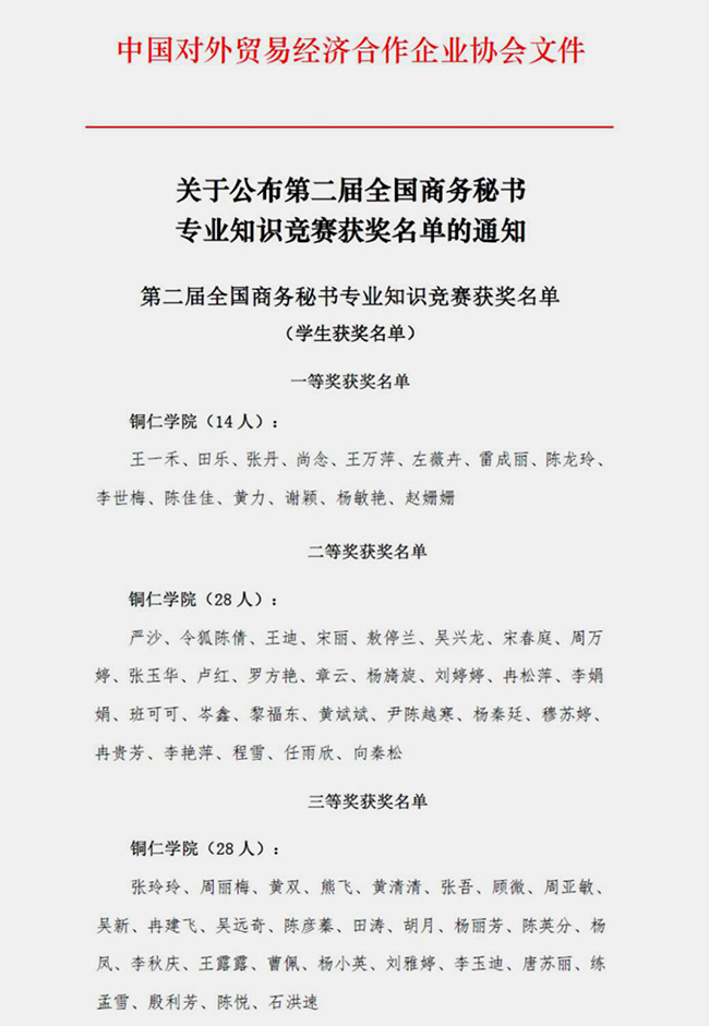 近日,中国对外贸易经济合作企业协会公布了第二届全国商务秘书专业知识竞赛获奖名单。人文学院秘书学专业王一禾等14人荣获一等奖,严沙等28人荣获二等奖,张玲玲等28人荣获三等奖,获奖成绩和人数均高于上一届。伟德官网还荣获了优秀组织奖。