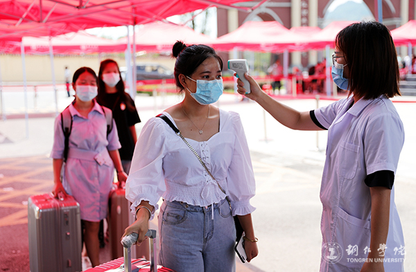 “同学,请出示健康码,然后按照指示扫码完成签到。”作为返校期间疫情防控的第一道防线,校门口的工作人员提醒着每位同学认真完成健康检查。在他们的引导下,同学们经过学校搭建的红色帐篷井然有序地完成了扫健康码、行李消毒、身份核查、体温检测和登记入校信息等层层关卡,通过所有检查关卡的学生方可进入校园。学校在宿舍楼、实验楼、图书馆、体育运动场馆等各个进口处,也全部设置了检测点。在宿舍门口,工作人员对返校学生再次进行登记个人相关信息,确保学生身体健康。
