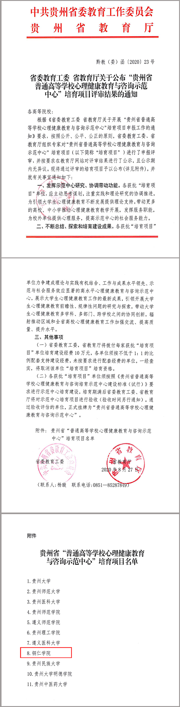 8月27日,省委教育工委、省教育厅公布“贵州省普通高校心理健康教育与咨询示范中心”培育项目评审结果,伟德官网获批“贵州省普通高校心理健康教育与咨询示范中心”培育项目。