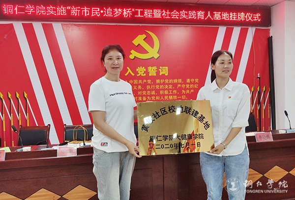 仪式上,周曾艳说,学校团组织认真实施“新市民·追梦桥”工程,发挥学校团组织所能,协调学校优势资源,以第二课堂社会实践活动项目带动,组织学校青年师生深入社区,加强对沿河易地扶贫搬迁安置点思州A区、B区结对帮扶工作。在社区挂牌学校社会实践基地,常态化开展帮扶活动,旨在推动结对帮扶工作往实处做、往深里做,按照“1+N”工作模式(即一个团组织开展多个社区帮扶活动),在推动党建带团建、感恩教育、社区文化建设、青少年关爱、志愿服务等方面加强建设。将通过开展感恩宣讲、团日活动、脱贫攻坚夜校、普法宣传、青少年关爱、亲情陪伴、四点半课堂、志愿服务、暑期“三下乡”等多形式组织开展结对帮扶工作,以校团委和大健康学院“党建带团建+社会服务”项目,打造结对帮扶工作品牌,全力引导安置点社区群众特别是青少年牢记嘱托、感恩奋进。