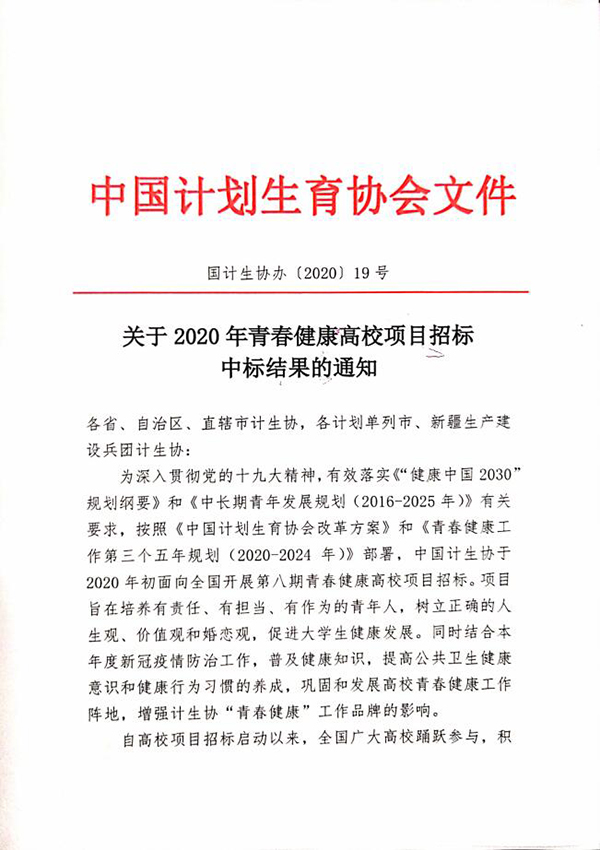 近日,中国计划生育协会公布了2020年青春健康教育高校项目中标名单,伟德官网申报的“知‘性‘智行,护航青春”成功中标项目A类,由中国计生协提供经费支持。