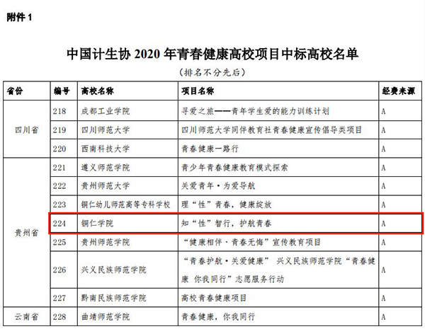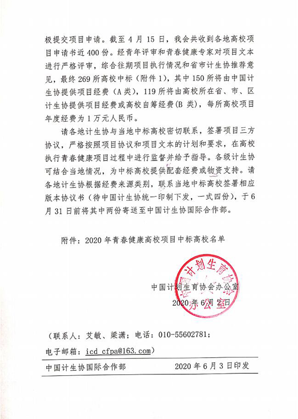 中国计生协于2020年初面向全国开展第八期青春健康高校项目招标,共收到各地各高校项目申请书近400份。经青年评审和青春健康专家对项目文本进行严格评审,综合往期项目执行情况和省市计生协推荐意见,最终269所高校中标,其中150所将由中国计生协提供项目经费(A类),119所将由高校所在省、市、区计生协提供项目经费或高校自筹经费(B类),每所高校项目年度经费为1万元人民币。