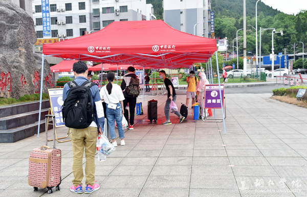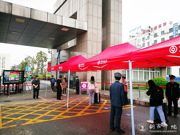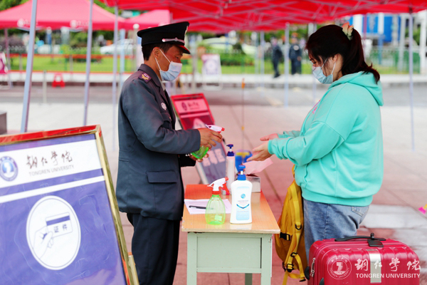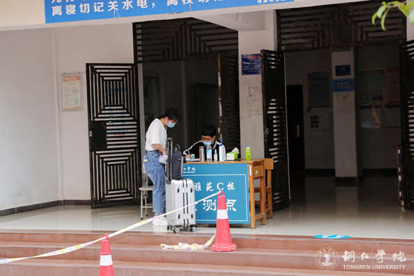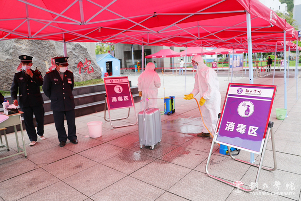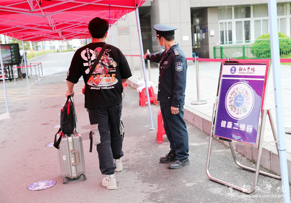 校门口,学校给学生安排了休息。学生进校报到时,按要求在指定的通道接受查验,学校工作人员对学生的身份信息和“健康码”进行了核对检查,对学生的行李进行了消毒处理。校门进口处的红外线体温测量仪器,准确地显示着每一位学生的体温并作出相应提示。学生进校后,学校统一安排隔离并进行核酸检测,待检测结果出来后,根据学校有关规定和安排,在校园里进行学习生活。