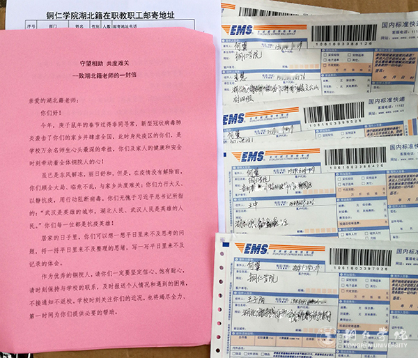 学校给湖北籍教师的慰问信和填好的邮寄单
