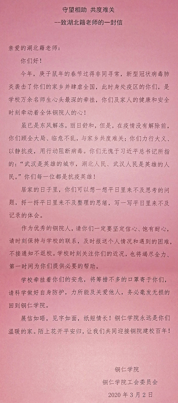 学校在《致湖北籍老师的一封信》里这样写道:“此时身处疫区的你们,是学校万余名师生心头最深的牵挂,你们及家人的健康和安全时刻牵动着全体铜院人的心。”“请你们一定要坚定信心、饱有耐心,请时刻保持与学校的联系,及时报送个人情况和遇到的困难。学校时刻关注你们的近况,也将竭尽全力、第一时间为你们提供必要的帮助。”“请科学做好自身防护,力所能及关爱他人,务必毫发无损的回到学校。bv伟德国际1946永远是你们温暖的家。”