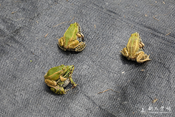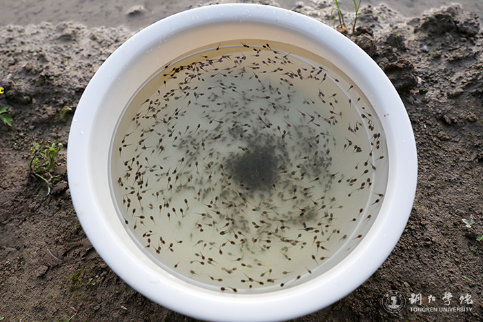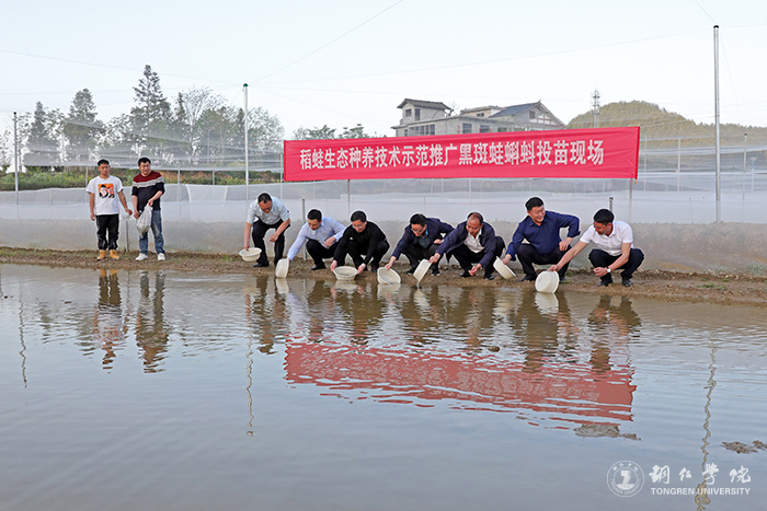 调研过程中,朱洪波一行还在德江县合兴镇东元村的稻蛙生态养殖示范推广基地,参加了由梁正其教授团队提供技术支持的稻蛙生态种养技术示范推广黑斑蛙蝌蚪投放仪式,举行了座谈交流。