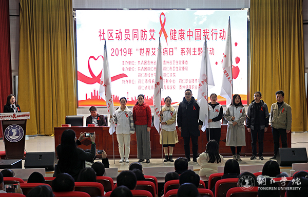 仪式上,出席领导向各高校防艾宣传志愿服务队授旗并共同启动了铜仁市2019年“世界艾滋病日”主题宣传活动。