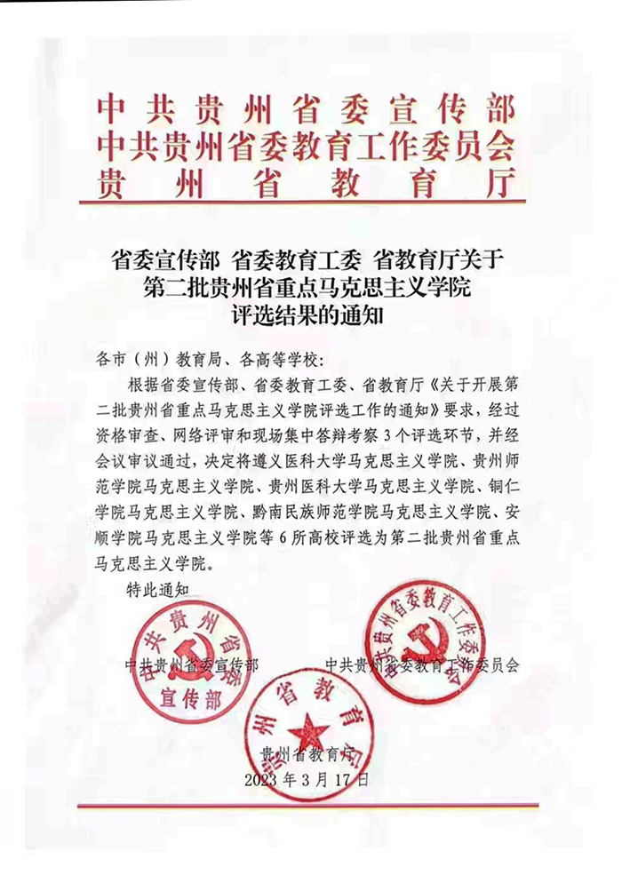 日前,省委宣传部、省委教育工委、省教育厅公布了第二批贵州省重点马克思主义学院评选结果,全省共有6所高校入选,伟德官网马克思主义学院入选其中。