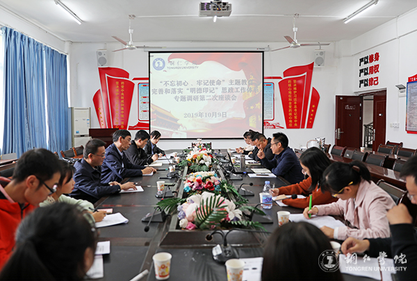 培根铸魂育新人,思想政治工作是学校各项工作的生命线。如何做好思想政治工作,落实立德树人根本任务,根据学校构建的“明德印记”思想政治工作体系,党委书记李树新以“完善和落实‘明德印记’思想政治工作体系”为题展开调研,分别组织学校党群行政部门,二级学院党委书记、学生科长、辅导员、学生代表召开了座谈会,走访了学生事务中心、学生寝室等。“明德印记”是学校加强和改进思想政治工作的核心理念,是学校构建思想政治工作体系凸显的特色亮点,大家结合自身的认识和理解,结合学校发展需要,从不同的角度,就如何更好地完善和落实“明德印记”思想政治工作体系纷纷提出了意见,为学校建构大“党建+大思政”工作格局、实施三全育人战略行动、培植“明德印记”大思政特色提供了很好的思路,对学校的管理、发展等方面提出了建议。