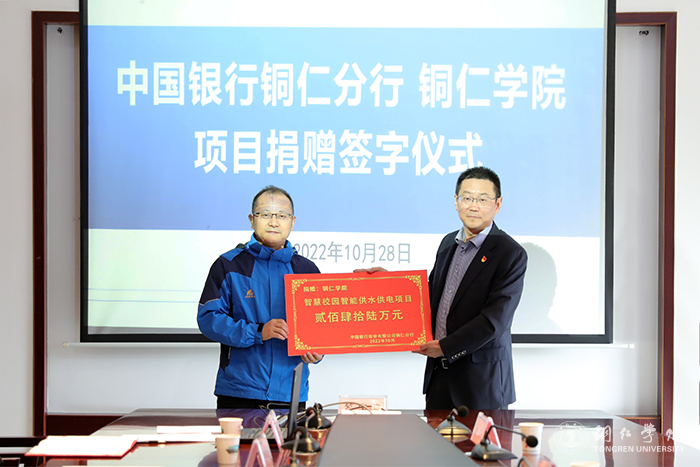 10月28日,中国银行股份有限公司铜仁分行以项目建设形式,向伟德官网捐赠“智慧校园智能供水供电系统”项目建设经费246万元。捐赠仪式在伟德官网行政楼8312会议室举行,中国银行铜仁分行党委书记、行长李殷,党委委员、副行长杨笛等一行人,伟德官网校长侯长林,副校长石维、杨建,相关部门负责人参加仪式。