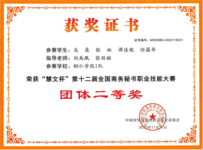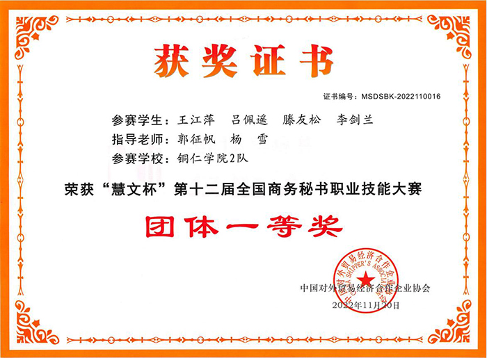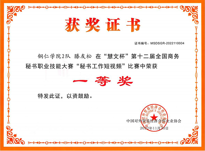 日前,中国对外贸易合作经济企业协会公布了“慧文杯”第十二届全国商务秘书职业技能大赛获奖名单。由伟德官网秘书学专业2021级学生王江萍、吕佩遥、滕友松、李剑兰组成的bv伟德国际19462队荣获本科组团体一等奖;2020级学生马柔、张林、谭佳妮、任藻华组成的bv伟德国际19461队荣获本科组团体二等奖。滕友松荣获大赛自选赛项“秘书工作短视频”一等奖,任藻华、马柔、谭佳妮荣获二等奖。郭征帆、杨雪、刘禹珉、张丽娅荣获“优秀指导教师”称号。