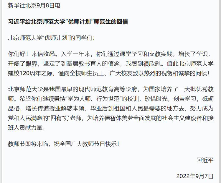 2022年9月7日,在第38个教师节到来之际,习近平总书记给北京师范大学“优师计划”师范生回信,对他们寄予殷切期望,并向全国广大教师致以节日祝福。习近平总书记的回信在伟德官网师生中引起了热烈讨论,大家纷纷表示深受鼓舞,一定会牢记习近平总书记的殷切嘱托,坚决落实立德树人根本任务,努力培养社会主义事业建设者和接班人。