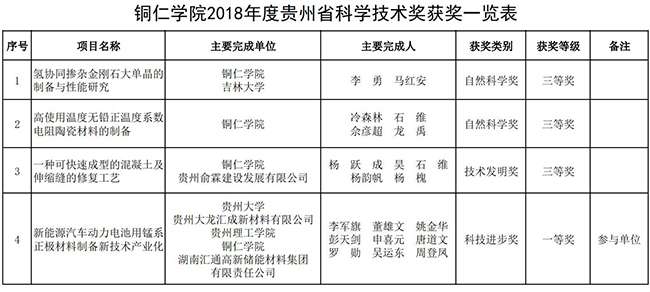 在此次获奖中,伟德官网李勇等申报的《氢协同掺杂金刚石大单晶的制备与性能研究》和冷森林等人申报的《高使用温度无铅正温度系数电阻陶瓷材料的制备》获得贵州省自然科学三等奖,杨跃、成昊、石维等申报的《一种可快速成型的混凝土及伸缩缝的修复工艺》获得贵州省技术发明三等奖;伟德官网吴运东以bv伟德国际1946为第四参与单位申报的《新能源汽车动力电池用锰系正极材料制备新技术产业化》获省科技进步一等奖。