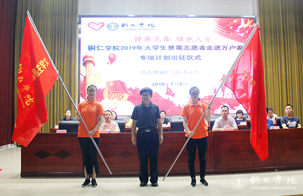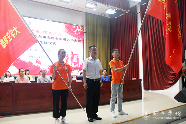 仪式上,饶小华和陈林为“三下乡”实践队伍与禁毒专项实践队伍授旗。