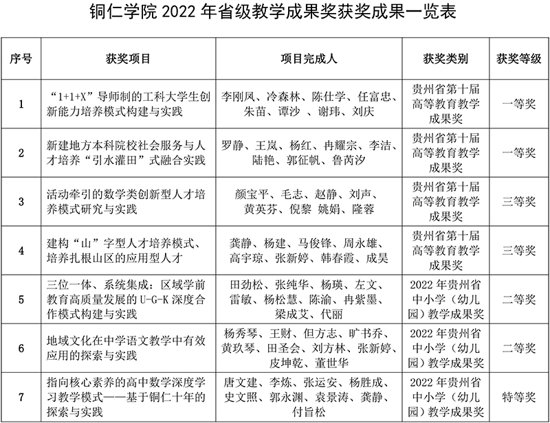省级教学成果奖是在教学实践改革和研究领域中颁授的最高奖项,代表了省内教学成果的最高水平,旨在发挥教学成果的引领激励作用,进一步提高教育质量。伟德官网高度重视教学成果奖培育工作,自2018年以来,持续立项建设校级教学成果奖培育项目35项,为学校教师梳理凝练教育教学成果提供保障与搭建平台。在此前公布的2022年贵州省中小学(幼儿园)教学成果奖评选中,伟德官网获得教学成果二等奖2项,参与获得特等奖1项。此次获奖的成果是学校创新人才培养综合改革、服务教育教学改革的一次集中体现。