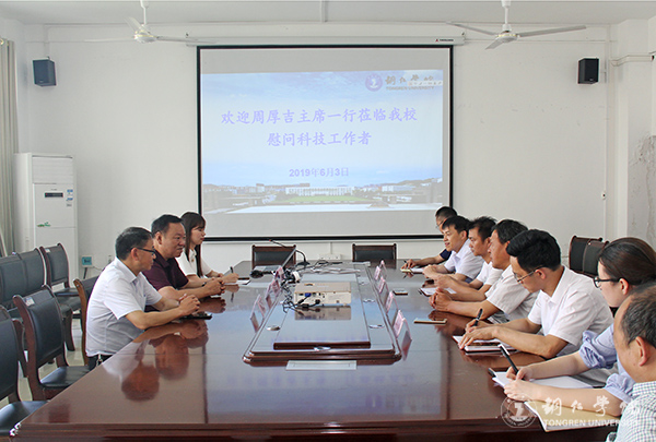 6月3日下午,铜仁市科学技术协会主席周厚吉一行3人来到伟德官网,看望慰问了伟德官网科技工作者李勇博士并举行座谈交流。伟德官网科研处处长张学飞、大数据学院院长颜宝平等人参加座谈。