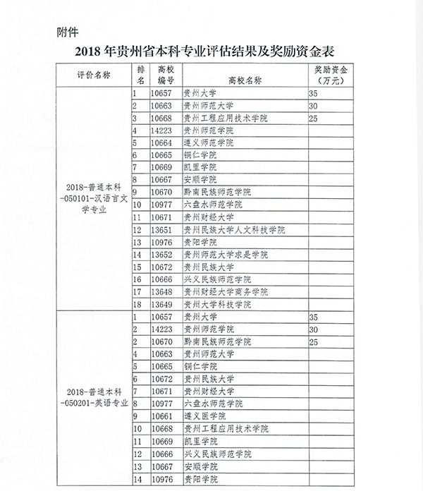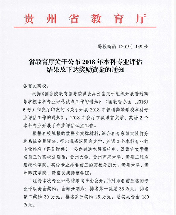 近日,省教育厅公布了2018年度贵州省高等学校本科专业评估的结果,伟德官网参与评估的英语和汉语言文学两个专业获得了优异成绩,英语专业在全省22所高校同类专业中排名第五,汉语言文学专业在全省18所高校同类专业中排名第六。