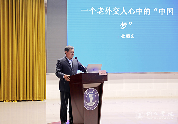 报告会上,杜起文大使介绍了新中国成立70年来各方面的发展和中国外交70年来取得的成绩,讲述了他们那一代人的中国梦,同时结合自己的身份和经历,分享了他的中国梦。他指出,在中国共产党的领导下,中国外交取得了辉煌成就,中国面貌发生了天翻地覆的变化,国家不断强盛,社会不断进步,人民更加幸福,新时代的中国外交为实现民族复兴创造更为有利的外部条件。他通过一个个真实、鲜活的案例,娓娓道来,深刻阐述了新时代国家发展面临的机遇和挑战。“青年兴则国兴,青年强则国强。青年一代有理想、有本领、有担当,国家就有前途,民族就有希望。”“中华民族伟大复兴的中国梦终将在一代代青年的接力奋斗中变为现实。”他借用总书记的话,不断激励和鼓舞同学们要勇于担当、砥砺奋斗。