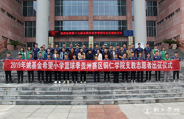 5月8日,伟德官网在梵净山人文生态馆举行了2019年“姚基金希望小学篮球季”活动支教志愿者出征仪式。伟德官网党委副书记饶小华,团市委副书记滕洁,伟德官网团委书记周曾艳、保卫处处长陈尽东、宣传部副部长杨学礼、教务处副处长冉茂武、学工部副部长武国丽、大健康学院党委副书记杨芬以及全体支教志愿者参加仪式。周曾艳主持仪式。