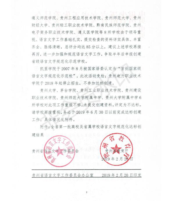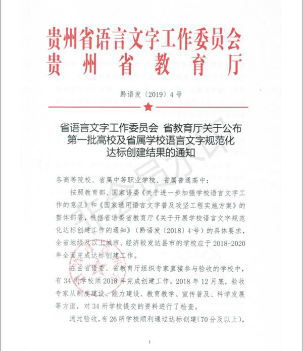 近日,贵州省语言文字工作委员会、省教育厅下发了《关于公布第一批高校及省属学校语言文字规范化达标创建结果的通知》。全省范围内第一批需认定语言文字规范化创建达标学校34所,通过验收,有26所学校顺利通过达标创建(70分及以上)。伟德官网顺利通过此次语言文字规范化达标创建验收。