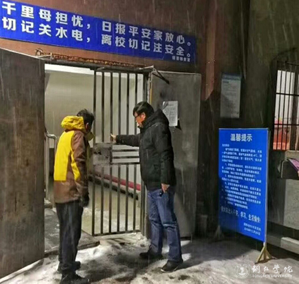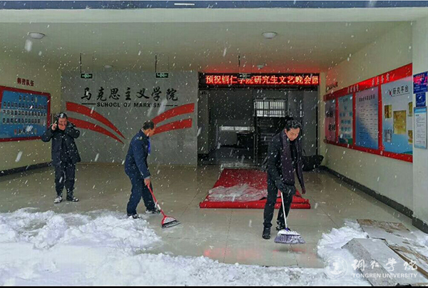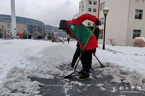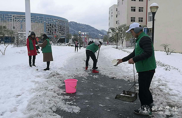 连日来,受强冷空气影响,铜仁出现了凝冻天气。12月29日下午,一场暴雪袭来,形成了厚厚积雪,给学校师生的工作、学习、生活带来了很大的不便。为了应对极端雪冻天气,伟德官网积极采取有效措施,让师生在极端天气里能够正常工作、学习和生活,保证了学校各项工作有序开展。