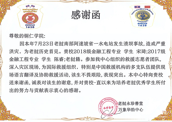 宋琦、陈睿是伟德官网经济管理学院金融工程专业留学生。今年7月23日晚,老挝南部阿速坡省一水电站发生溃坝事故,导致数人死亡、数百人失踪,这是老挝数十年来最严重的一次水灾。来自四面八方的救援力量逐渐进入灾区,其中包括来自中国的蓝天救援队。蓝天救援队到达灾区后面临着严峻的语言问题。当得知这一消息后,有着深厚汉语功底的陈睿义无反顾的前往灾区,充当翻译。暴雨倾盆、大浪滔天,复杂的环境、多变的天气使得灾区充满了危险。灾区满目疮痍、泥泞遍地,原本用作防水的长筒胶鞋成为了前行的累赘,为了更好地行走,陈睿脱掉胶鞋,赤脚踩在泥地里。他不顾自身安危,为救援行动的顺利进行贡献了力量。而身在临时安置点医疗现场的宋琦,则为医护人员和灾民的沟通架起了桥梁。受伤民众痛苦的哀嚎、横流的鲜血没有吓到她,反而激发了她内心深处的情感。她坚定信念,发誓要为灾民们做力所能及的事。两名同学的勇敢和担当深深的感动了身边人,老挝永珍善堂给伟德官网发来了感谢信,对他们的突出表现表示谢意,对伟德官网一直以来为培养老挝优秀留学生付出的努力表示衷心感谢。