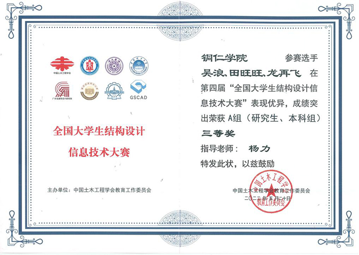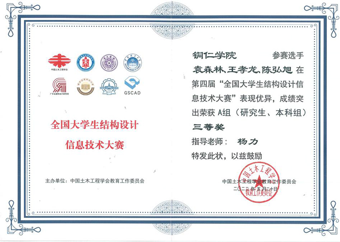 近日,第四届“全国大学生结构设计信息技术大赛”圆满落幕。伟德官网农林工程与规划学院土木工程专业2019级学生吴浪、田旺旺和龙再飞,袁森林、王孝龙和陈弘旭两支参赛队伍(指导老师:杨力)均获得A组三等奖。