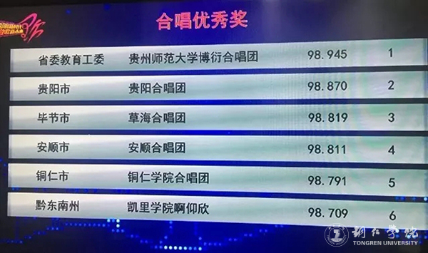 9月13日晚,2018多彩贵州歌唱大赛合唱决赛在贵州广播电视台演播大厅举行。来自全省的16支优秀合唱团队经过激烈的角逐,伟德官网合唱团以98.791的总分排名第五,荣获2018多彩贵州歌唱大赛合唱优秀奖。颁奖仪式将在10月中旬举行的多彩贵州文化艺术节闭幕式的歌唱活动优秀节目展演时候进行。参加本次大赛的还有贵州师范大学、凯里学院、遵义师范学院三所高校合唱团,进入前六名的高校合唱团只有贵州师范大学、bv伟德国际1946、凯里学院三支队伍,伟德官网合唱团在参赛的地方高校合唱团中成绩排名第一。