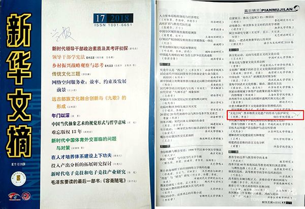 《新华文摘》作为我国人文社会科学权威学术文摘的杰出代表,具有深远的学术影响力,文章是否被转载收录,在相当程度上反映着其学术水平的高低。该文能够被《新华文摘》篇目辑览收录,这既是对作者学术创作成果的充分肯定,也是对学报编校工作的有力鼓励,更是很好地彰显出了学校的学术风采。