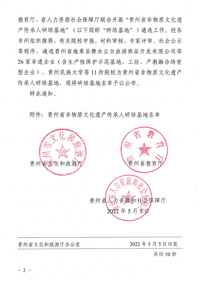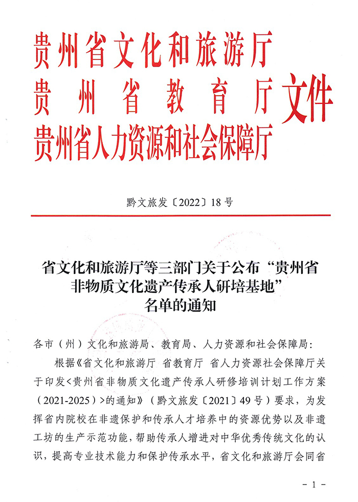 日前,省文旅厅、教育厅、人社厅联合发文,公布了本年度贵州省非物质文化遗产传承人研培基地名单,bv伟德国际1946作为高等院校培养基地入列其中。