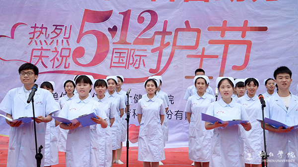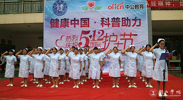 此次活动内容丰富、形式多样。活动中,护理系的同学们头戴燕尾帽、身着白衣给大家带来了精彩的文艺表演。他们怀揣着对护理职业朴素的情感,饱含深情地朗诵了《白衣天使之歌》,为大家带来了精彩的手语表演《感恩的心》,无不让人动容;他们在欢快的音乐声中为大家展示了医务人员进行操作前的七步洗手法,使大家了解到了七步洗手法在日常生活中也是预防疾病最简单有效的措施;他们上演了关于心肺复苏操作讲解的情景剧《约会奇遇》,表演不乏幽默,引来现场阵阵笑声,又让观众了解到了在发生意外时,心肺复苏操作抢救生命、分秒必争的重要性。活动中,体育教育专业的同学们为大家带来的一段动感的健美操再次活跃了现场,掌声不断。最后,同学们在护理健康系老师蔡春莲的带领下庄严宣誓了南丁格尔誓词;各领导与大健康学院护理健康系师生进行合影留念。