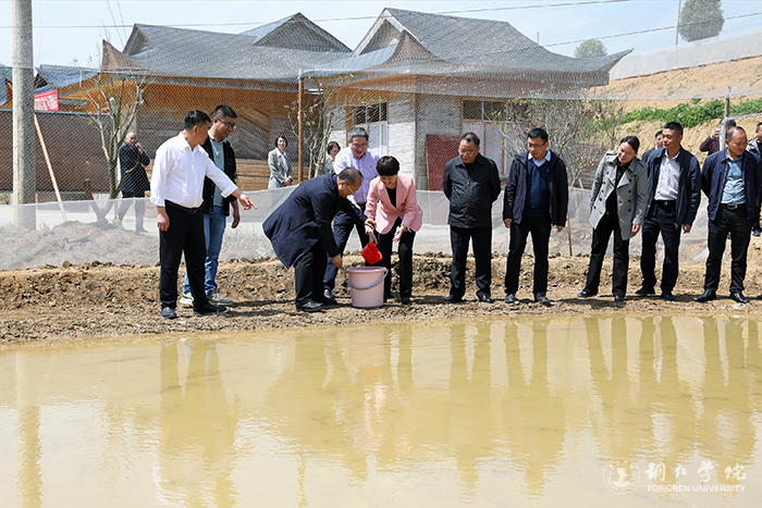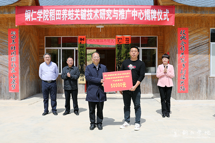 仪式上,侯长林、敖华共同为“bv伟德国际1946稻田养蛙关键技术研究与推广中心”揭牌;杨建、何先美为“贵州省博士协会博士科创园大学生双创示范基地”揭牌;李建新、陈彪为“铜仁时兴农业科技有限公司”揭牌。侯长林代表学校向合兴镇龙溪村捐赠了产业发展资金5万元。参加仪式全体人员向稻田养蛙试验基地里进行了蛙苗投池活动。